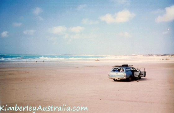 This scan of an old Cable Beach picture shows what I remembered: 22 km of pristine sands. The edge is firm enough to drive on. I think that last fact is what I liked best about it. And you don't need a four wheel drive. Look at our old station wagon...