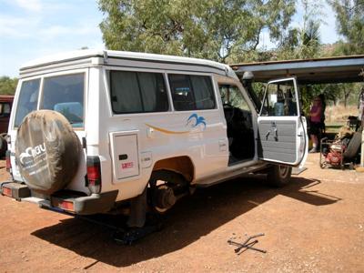 Luckily we'd packed a compressor and were able to top up the slow punctures every 5 kms and thankfully we were only 20 kms from Imintji Stores/Repairs. There they quickly diagnosed that both the rear tyres needed replacing (they were very worn) and the inner tubes were pretty much tea-bags. We were quite glad, as we'd heard roads were rough up the Mitchell and now we had two brand new Bridgestones at the rear! The fronts looked fine, but I wish we'd been more observant about the state of the rears when we'd picked up Marlene. Not a lot we could have done if it had happened in a more remote area! We were lucky and thankful that it happened where it did and that we'd decided to skip the side road we'd almost taken to look at an extra gorge.